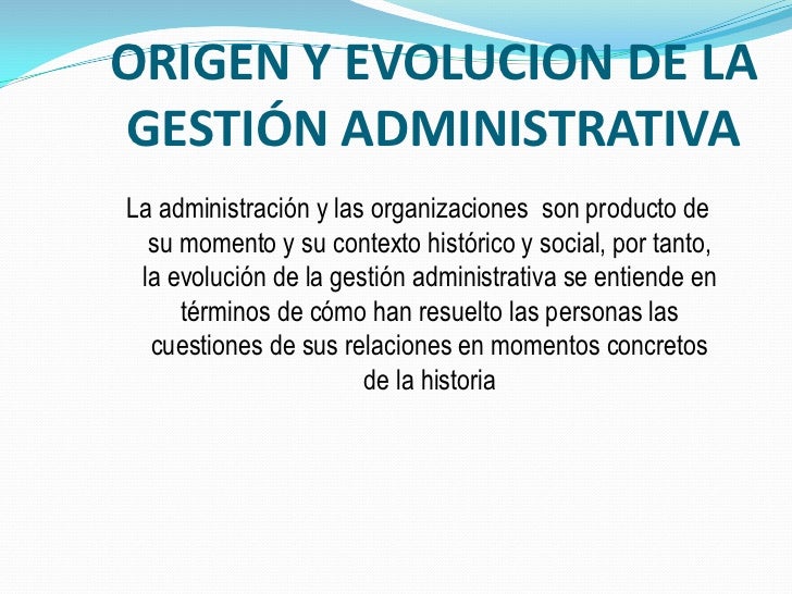La administración y las organizaciones  son producto de su momento y su contexto histórico y social, por tanto, la evolución de la gestión administrativa se entiende en términos de cómo han resuelto las personas las cuestiones de sus relaciones en momentos concretos de la historia